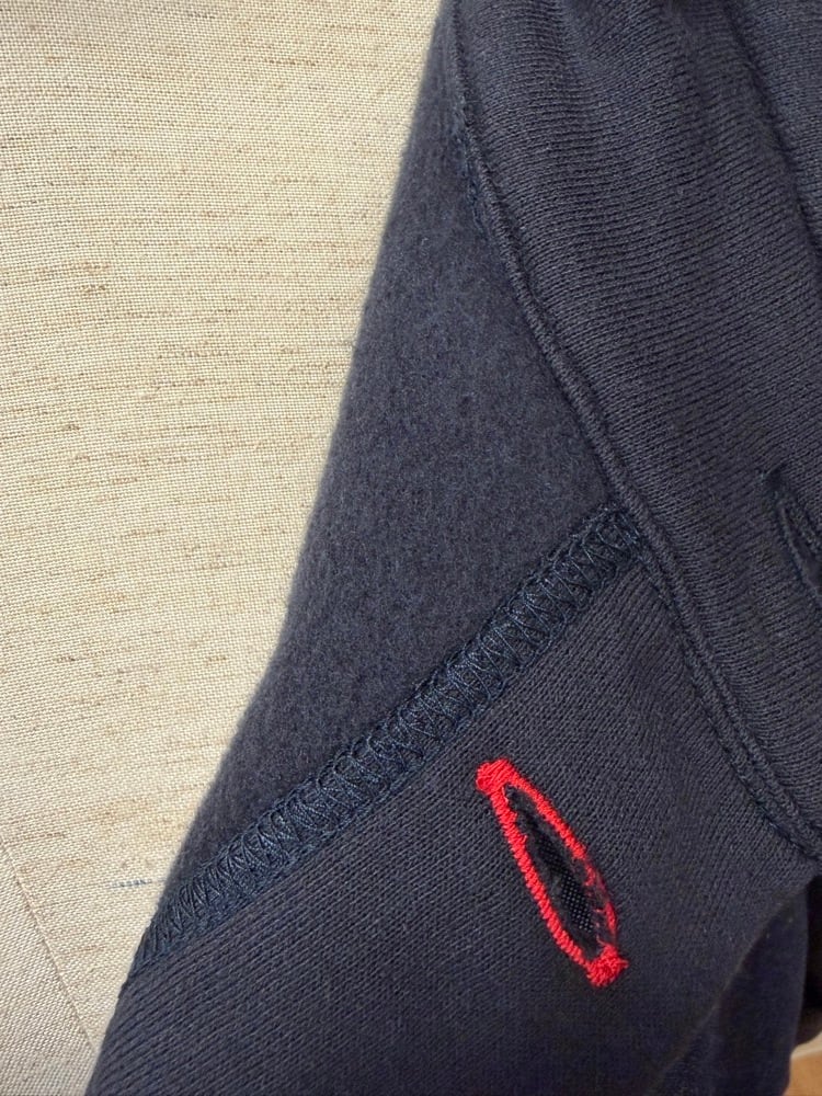 技ありのネックデザイン: 首元はボタン付きのハイネック仕様。赤い糸で縁取られたボタンホールが、シックなネイビーの中でお洒落な差し色になっています。