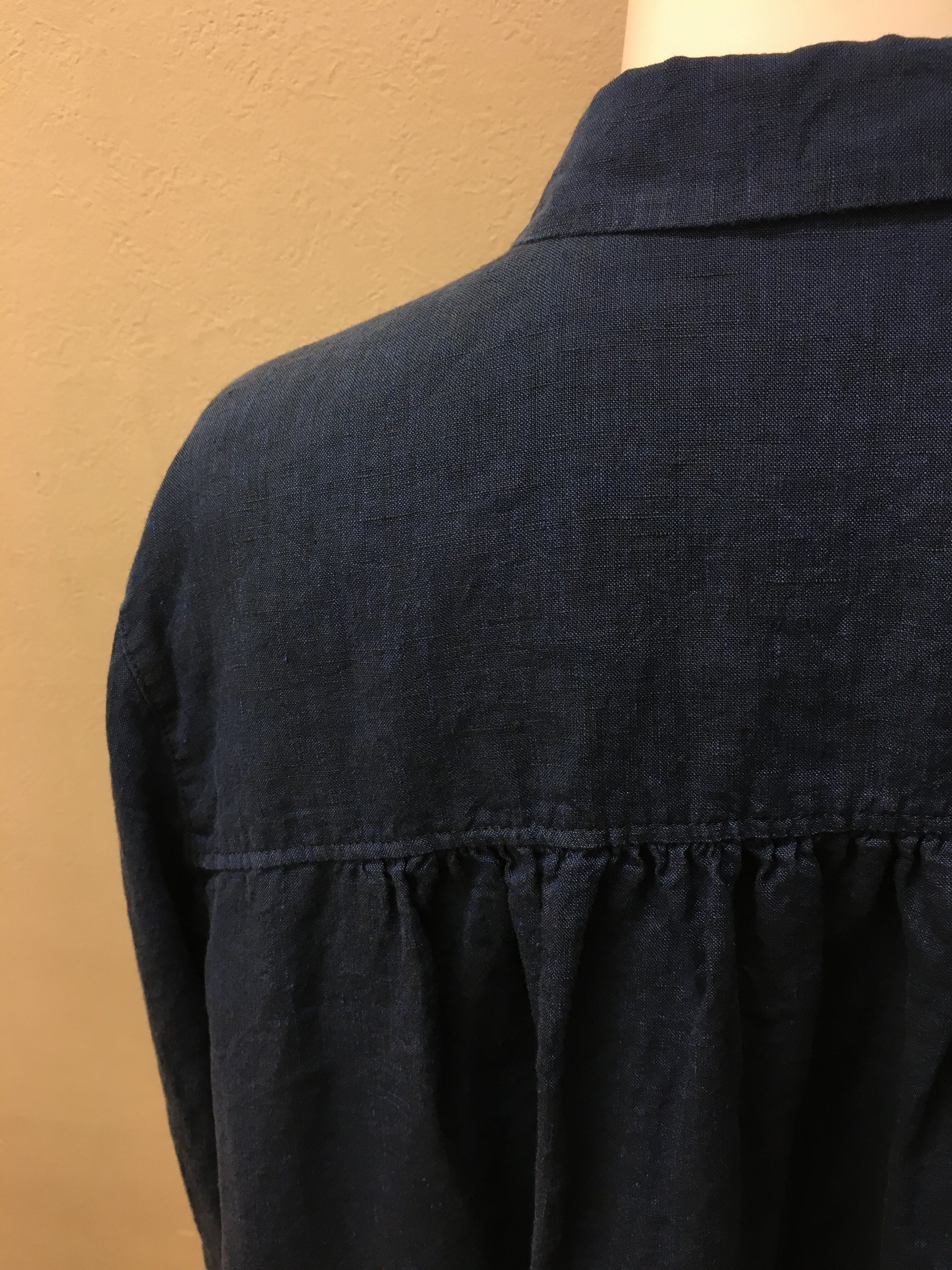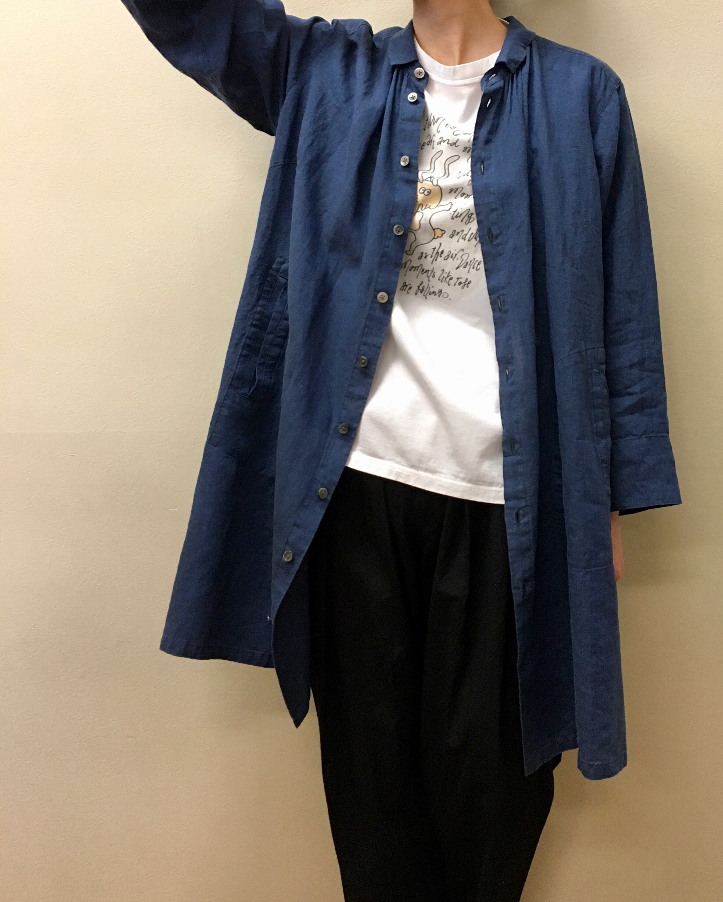 ゆったりとした着心地のロング丈のシャツ。見た目にも涼しい青色の生地は、涼感たっぷりのフレンチリネンです。やわらかな肌触りの生地は長く着るほどに肌になじみます。
