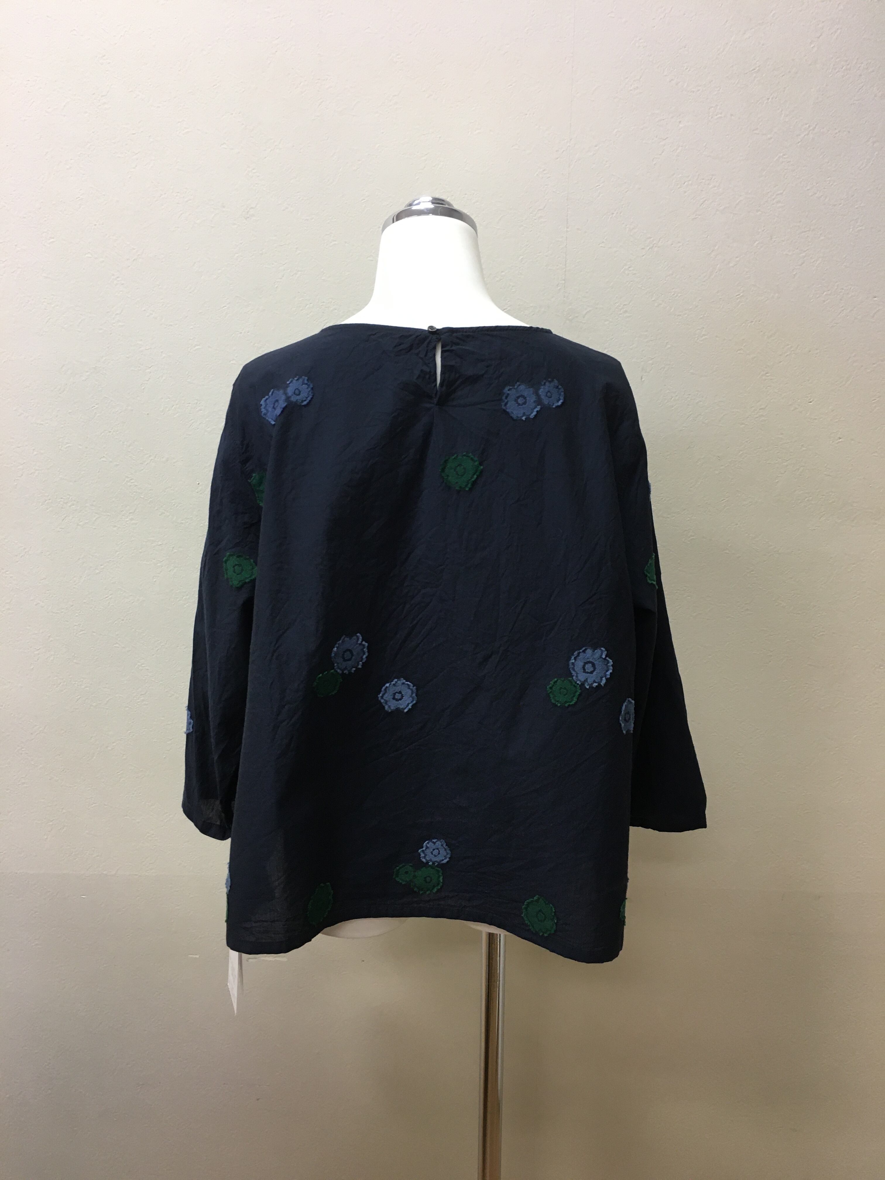 立体感のある花のモチーフが甘すぎない上品な仕上がりに。涼しげな生地の肌触りとゆとりのあるシルエットも魅力です。