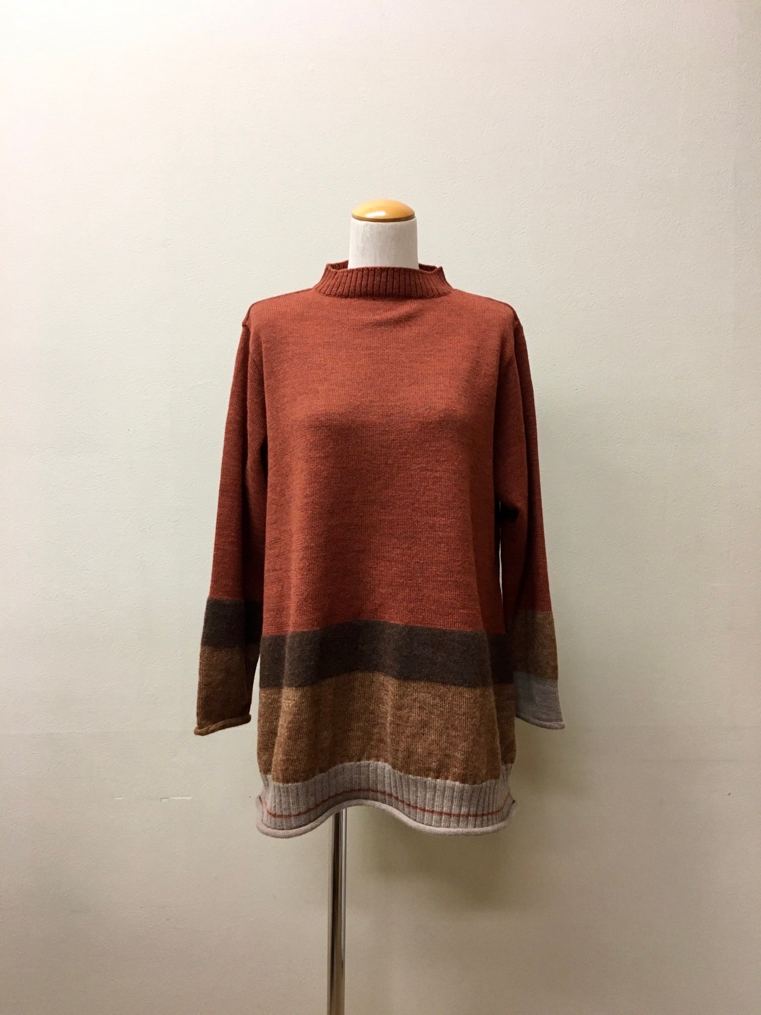 左右の袖口や見頃の裾に、ランダムな配色の切り替えをしたリブネックのプルオーバー。明るく暖かみのある色合いが秋冬にぴったりです。