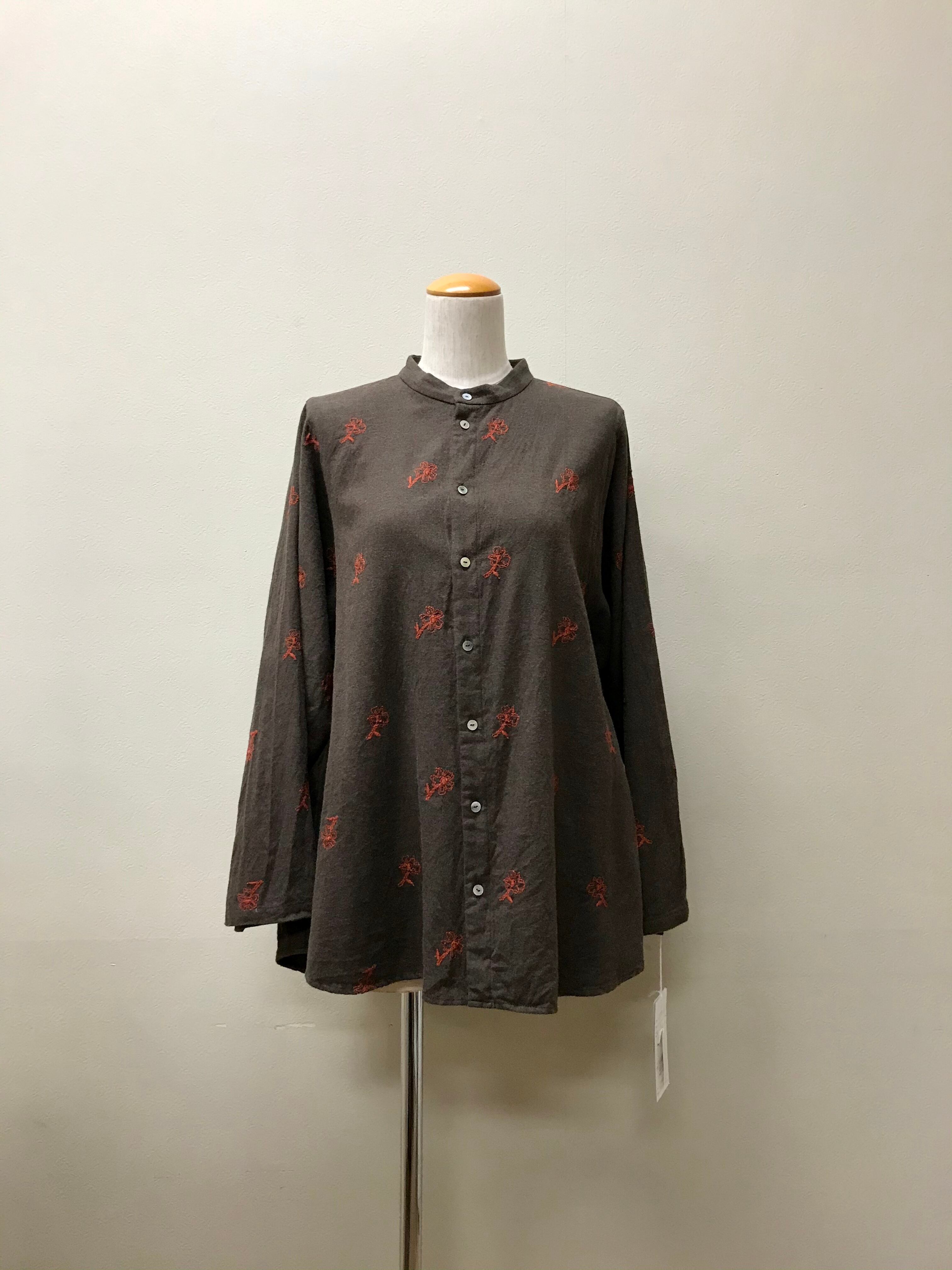 お花の刺繍が可愛いバンドカラーシャツ。しなやかで暖かみのある風合いのビエラフランネル仕上げです。綺麗目な印象のバンドカラーですが、ゆったりした着心地でカジュアルに着こなすのもオススメです。