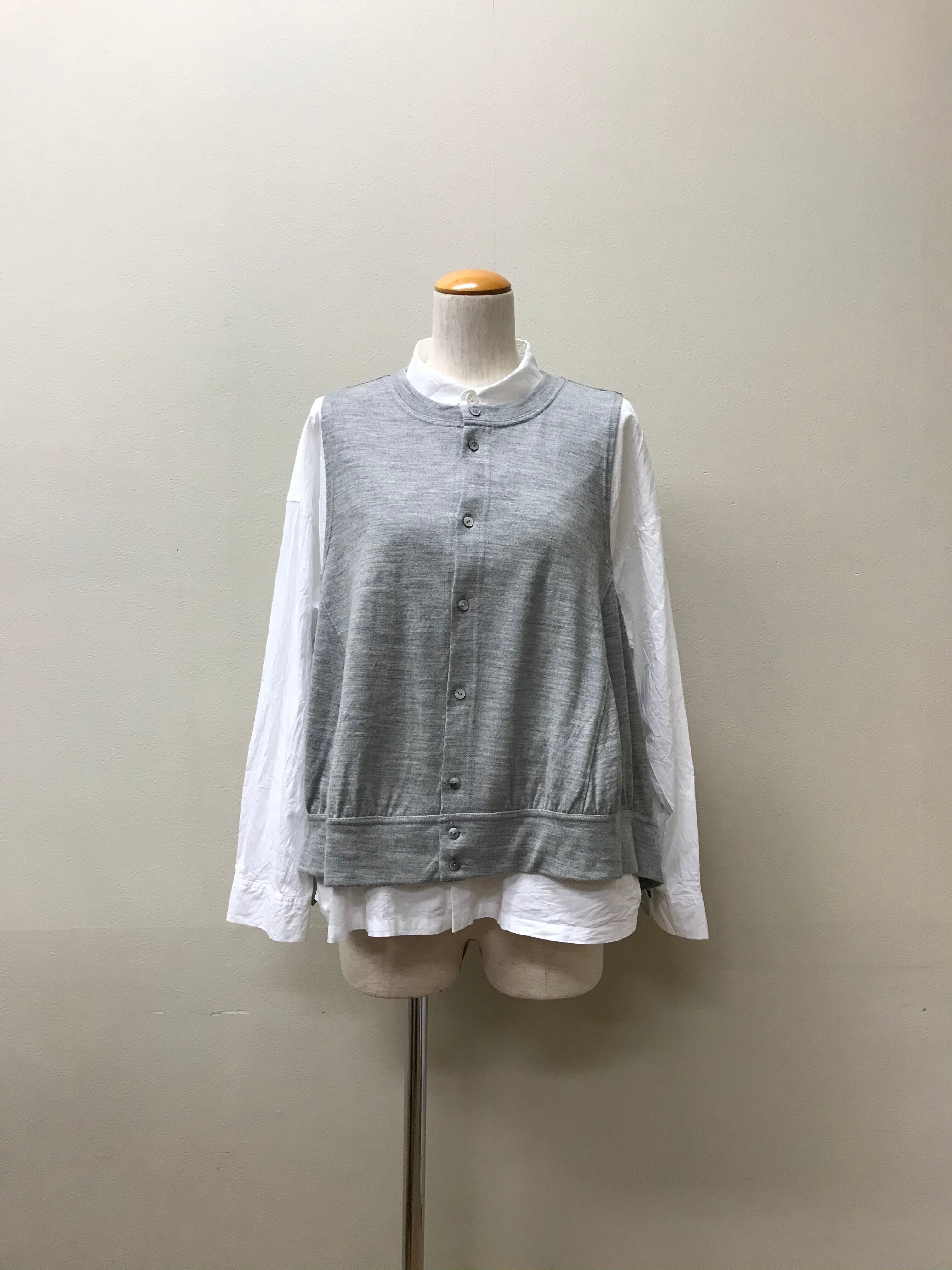 洗えるウール100%のベスト。裾の切り替え、ギャザーがポイントになっており、後ろの長いブラウスなどとの相性も抜群です。また、薄手で伸縮性に優れ暖かみもあり冬の重ね着に重宝します。