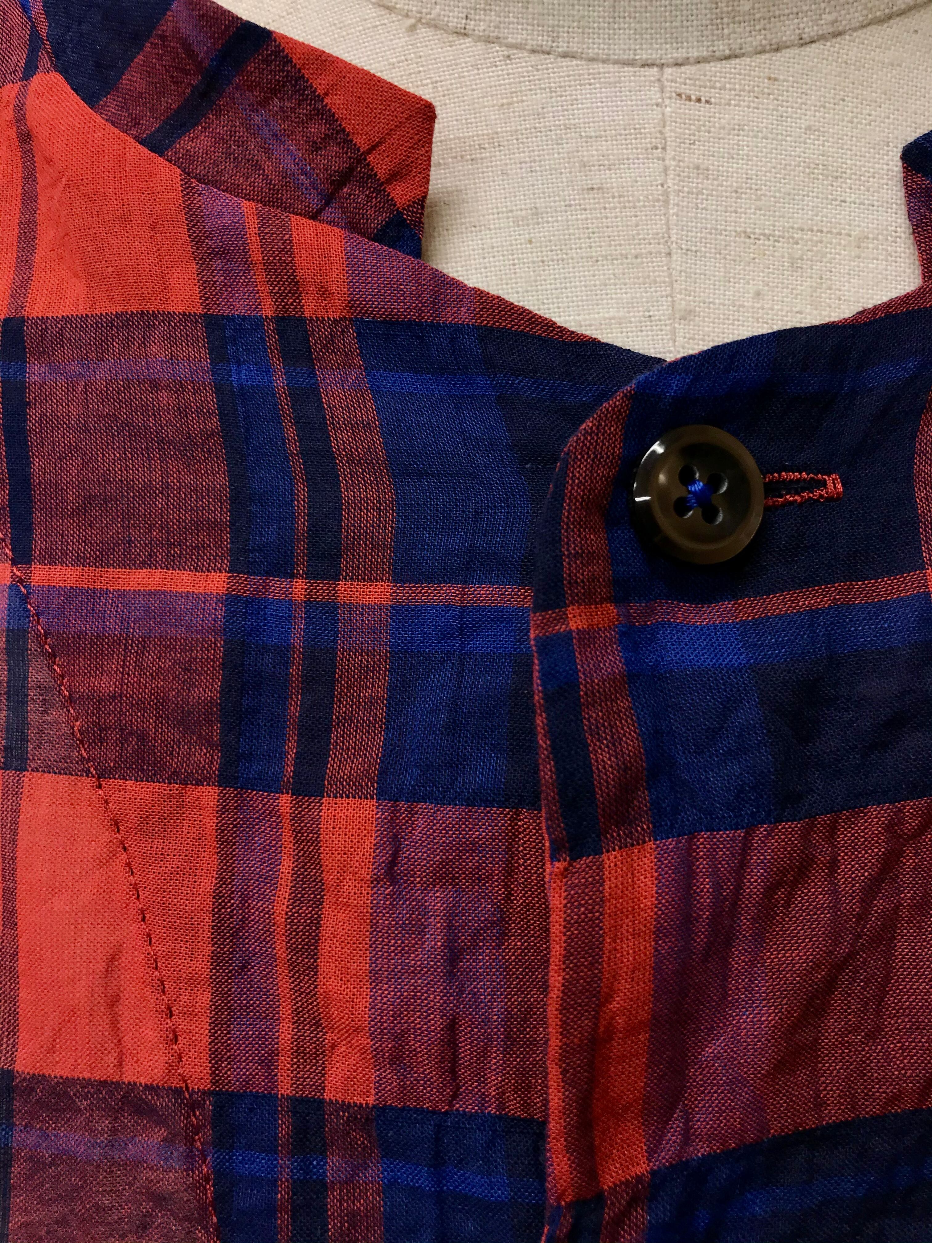 スタンドカラーの上品さと赤と紺のチェック模様のカジュアル感を併せ持つ長袖ブラウス。シャーリング加工で風合いのある綿麻の生地はとても涼感のある仕上り。
