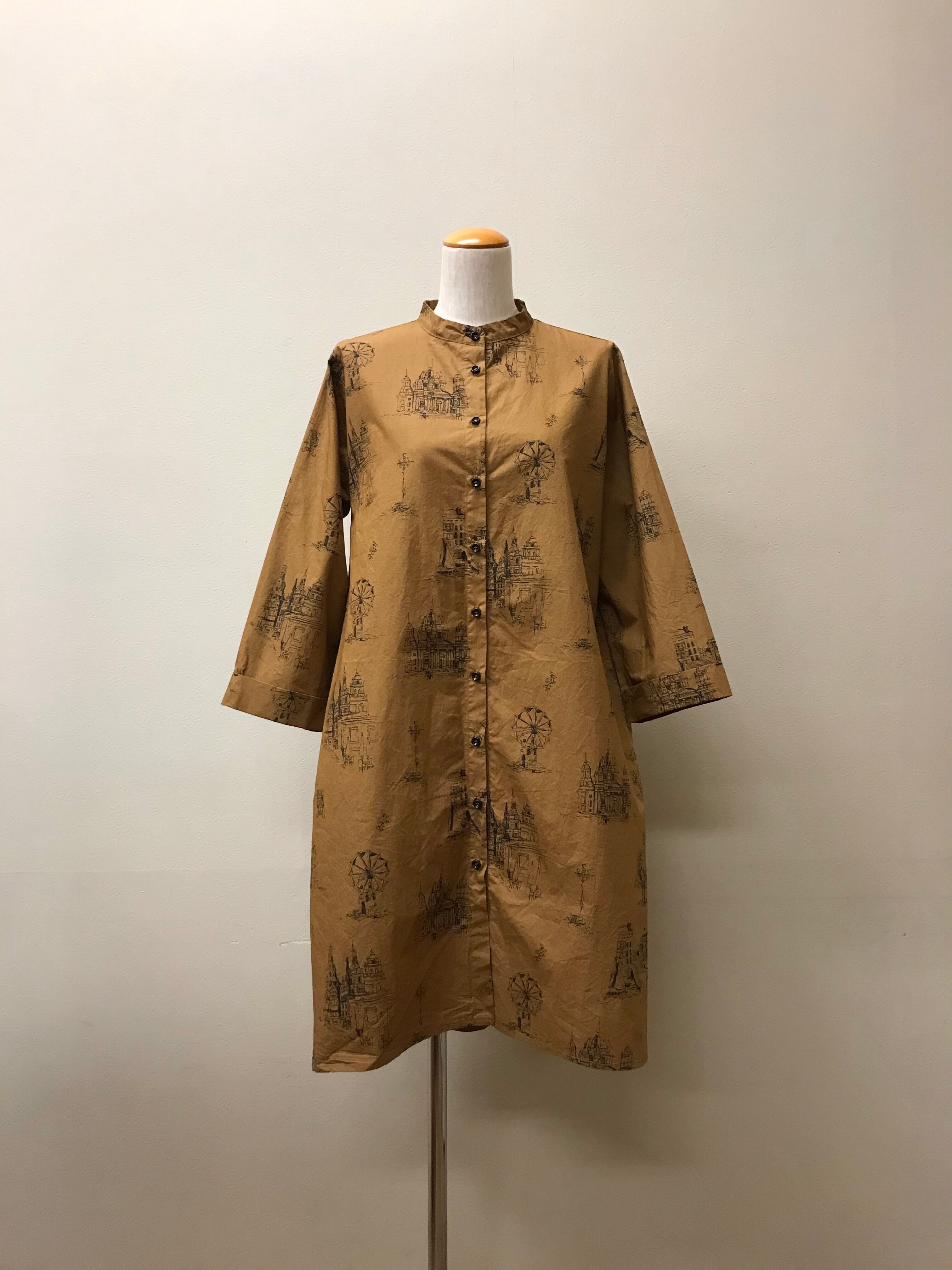 秋を感じさせるキャメル色のブロード生地は程良いハリ感とシワ感でナチュラルな雰囲気。夏用の生地より少しだけ厚めの生地なので、日によっては暑い日もある秋のお出かけにおすすめ♪旅先で写真を撮った時に映える風景柄が楽しく素敵な1着です。
