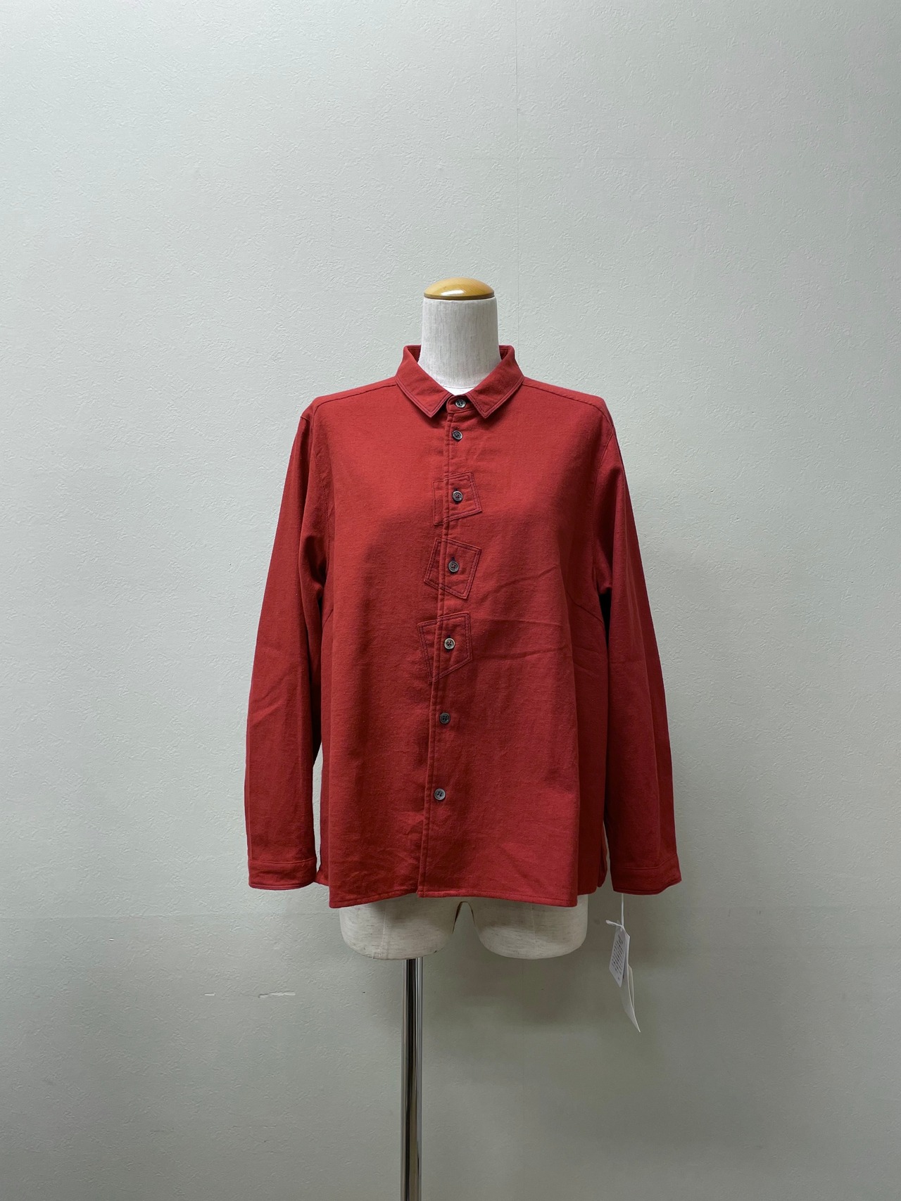 しっとり柔らかで暖かみのあるコットン起毛ツイル素材のブラウス。鮮烈かつ深みのあるオレンジ色が魅力的。パッチワーク付きなので、ベストやカーディガン、コートのインナーにしても存在感抜群♪地味になりがちな冬のコーディネートにおすすめです。