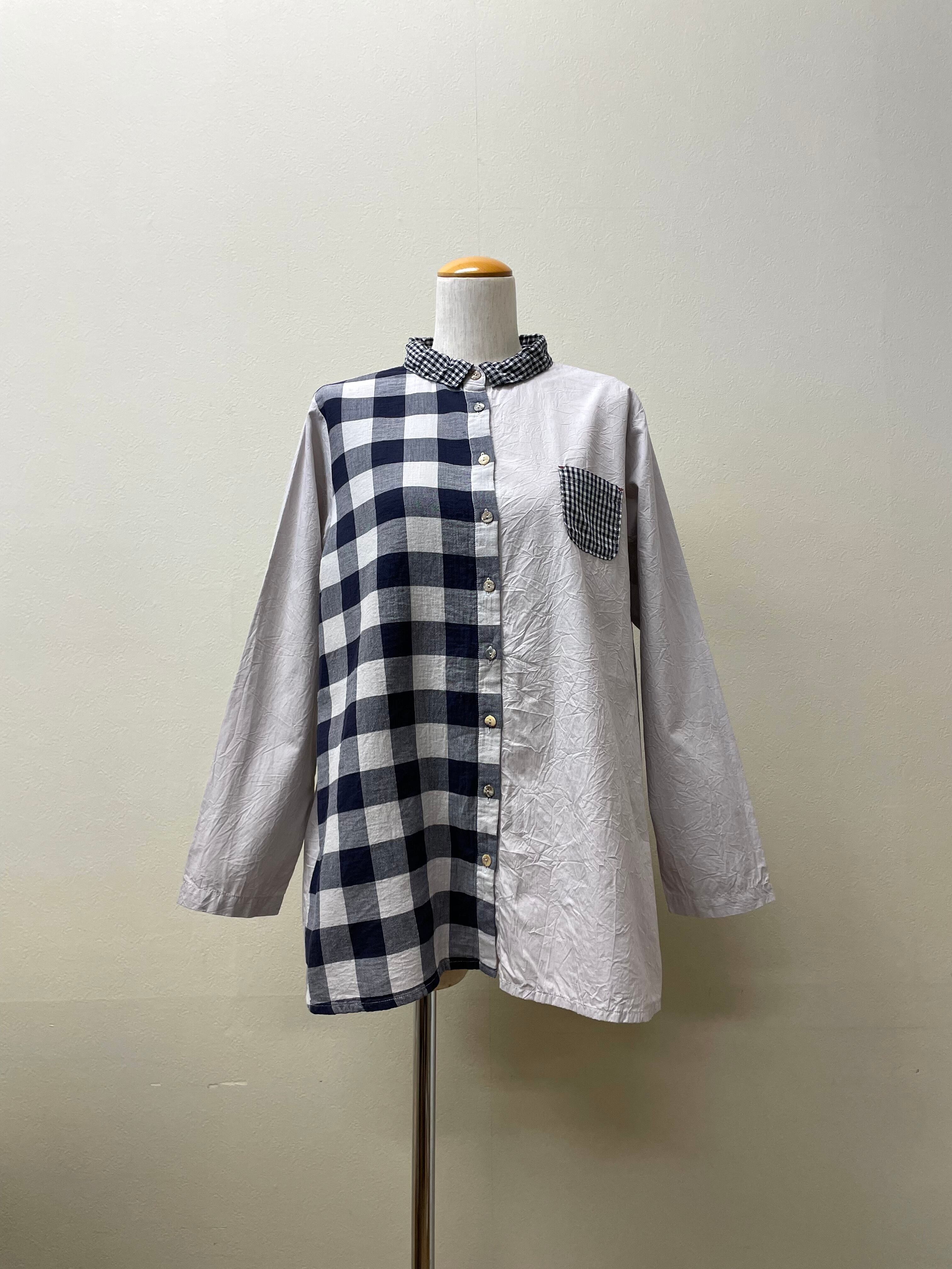 襟と胸ポケットにギンガムチェック、右見頃にブロックチェックを使った組み合わせが楽しいシャツブラウス。ナチュラルな質感で大人のカジュアルコーデが楽しめます。