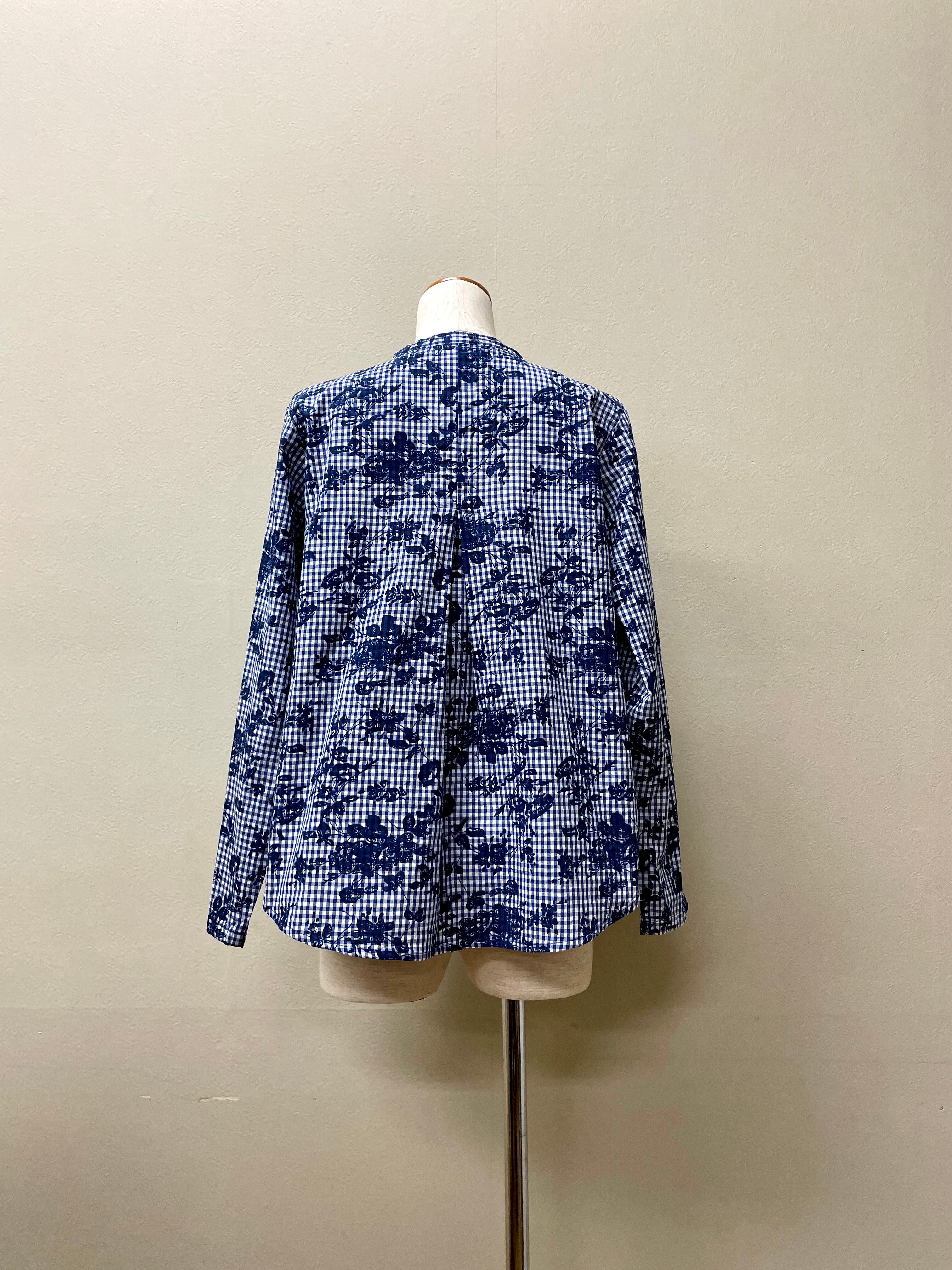 pousse 花柄ギンガムバンドカラーシャツ