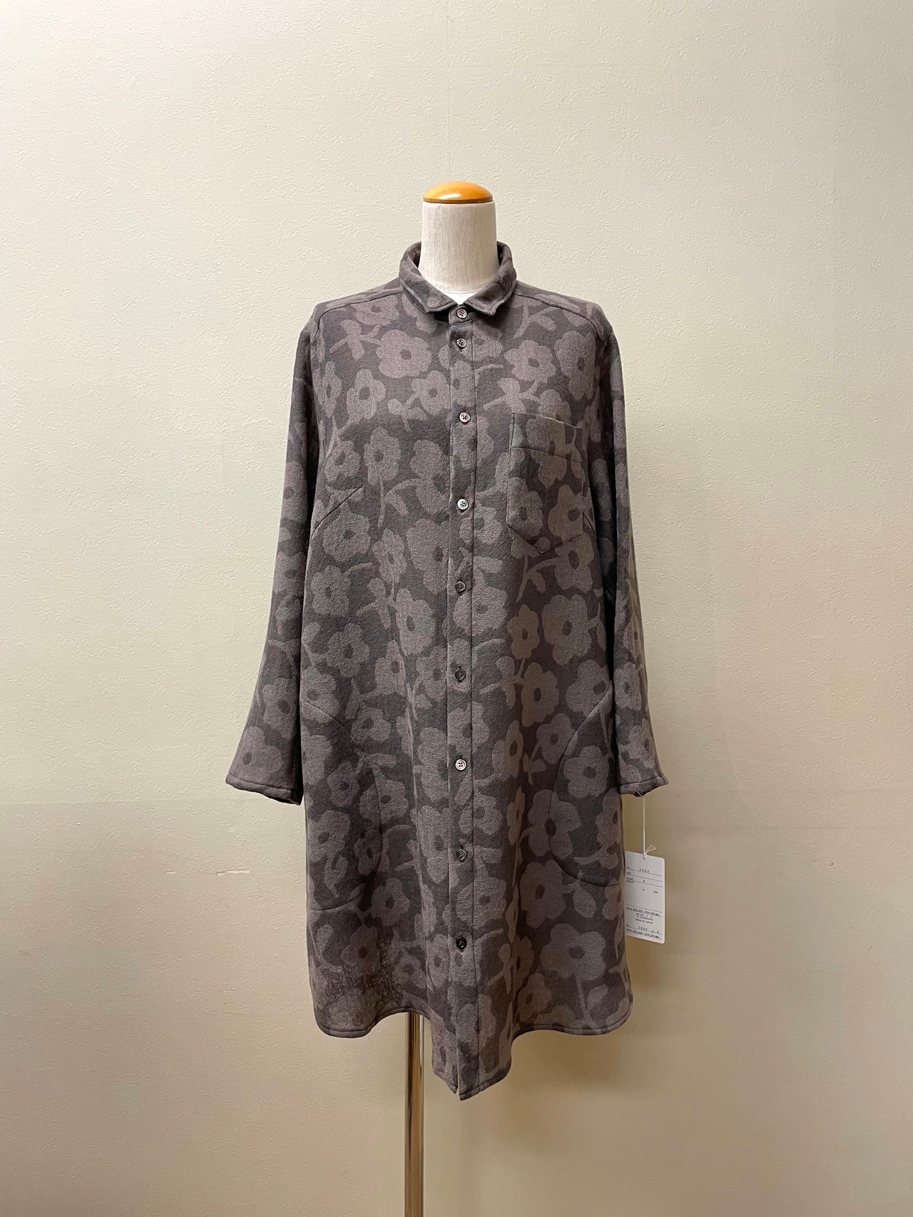 北欧風の大きめの花柄が印象的なロングシャツ。素材は軽くて暖かみのあるウールガーゼ。きちんと感もあるのでお出かけ用にもおすすめです。