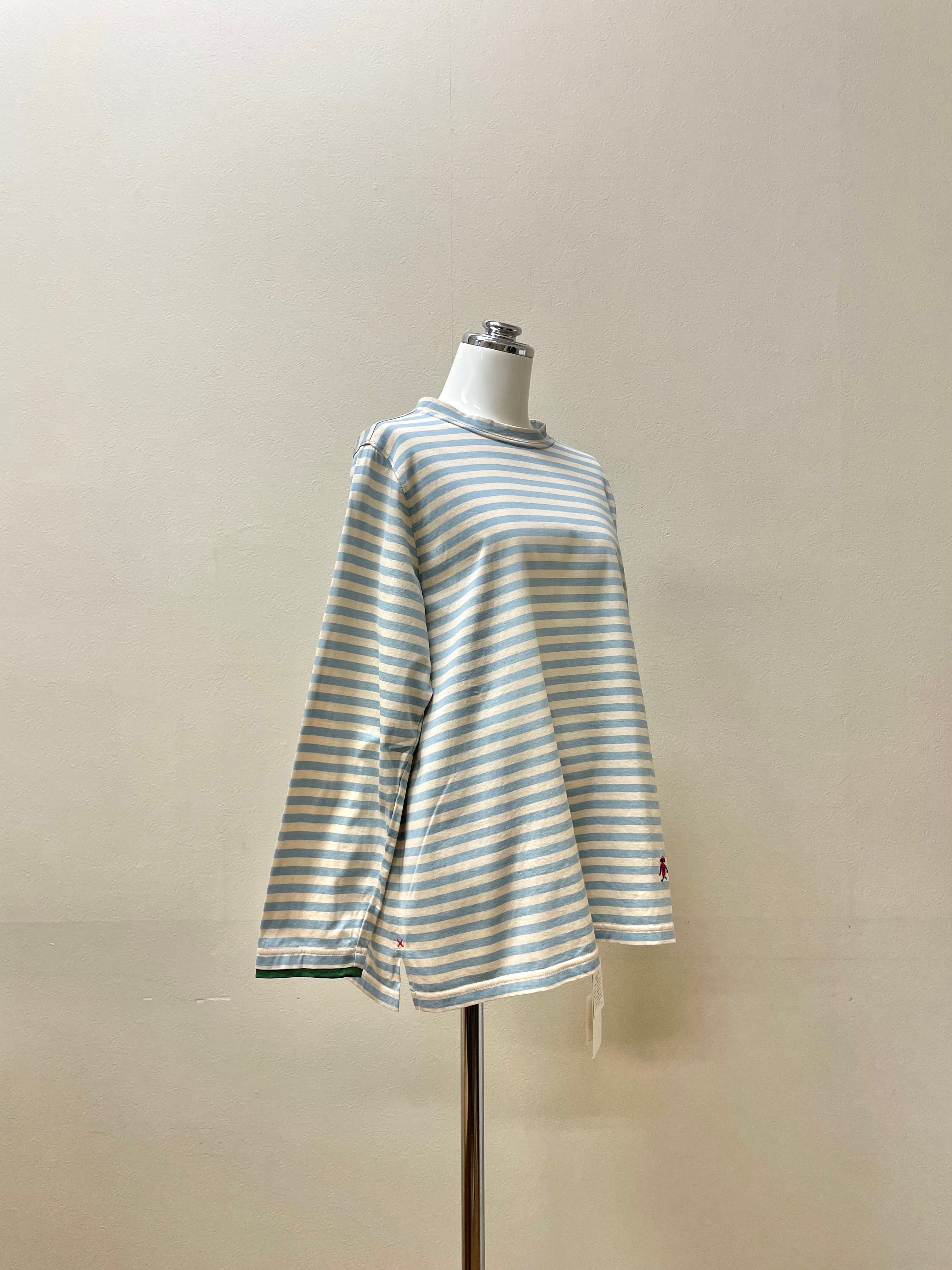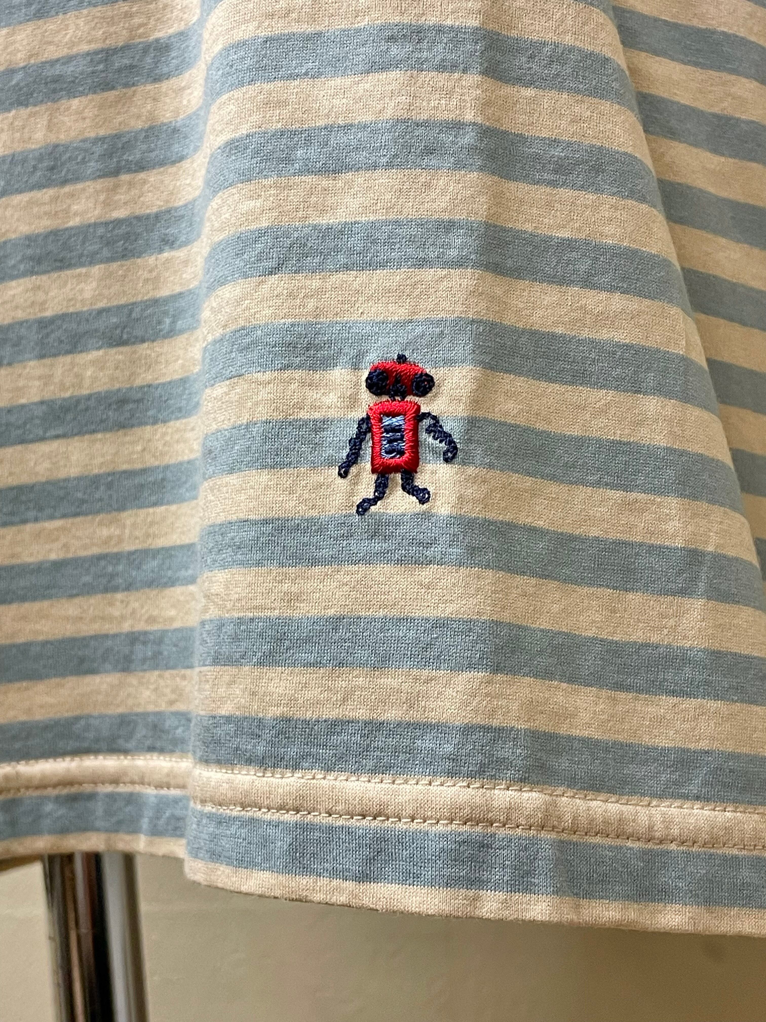 コズオリジナルなるのロボット刺繍が可愛いボーダーのカットソー。さらりと肌触りの良い綿100%シルケット天竺を使用してます。袖口の配色や裾のスリット&バッテンカン止めなど細部へもこだわりも◎