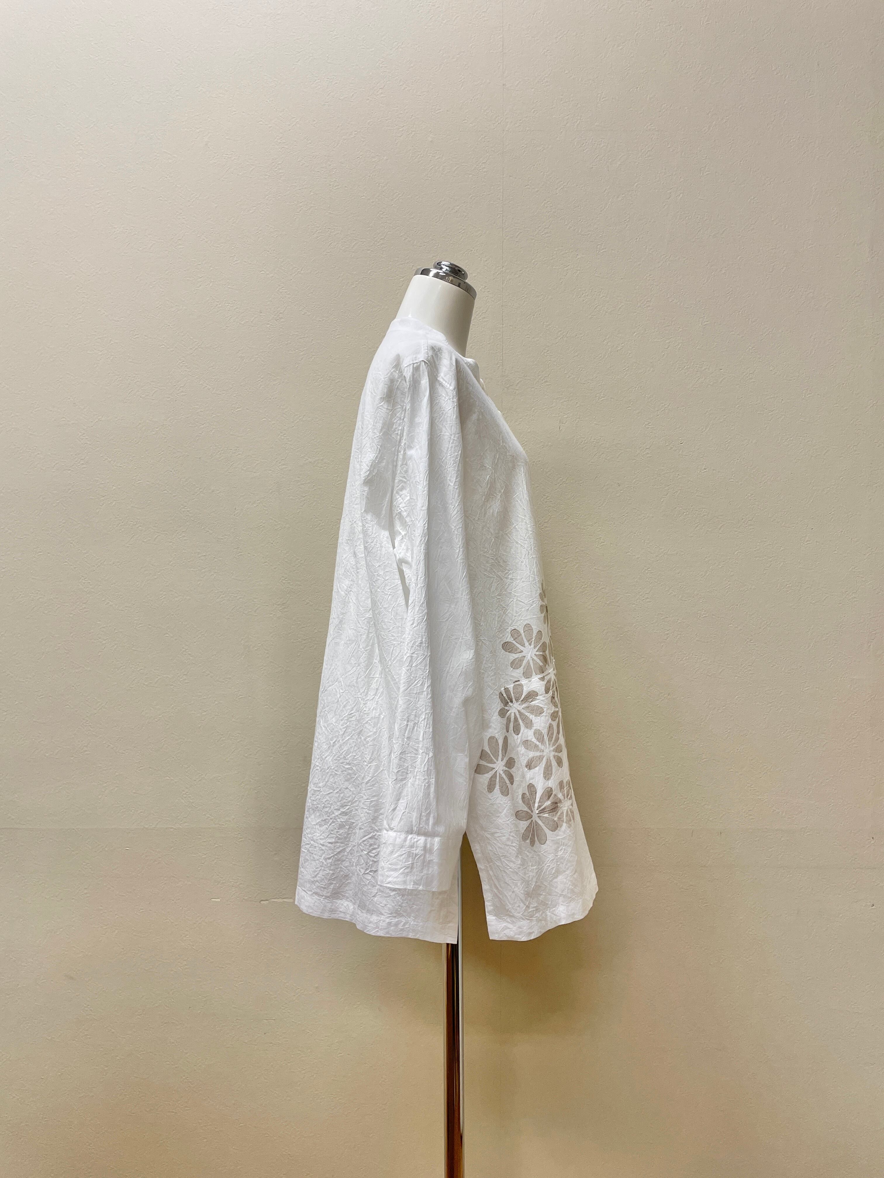 手描きで描かれた繊細な水彩花柄が特徴のブラウス。ナチュラルなシワ感の綿ローン素材は手で揉みこんだようなしゅくしゅく感で涼感のある仕上がり。ゆったりと長めの着丈で着心地も良く、上品さとリラックス感と良いとこどりの1着です。