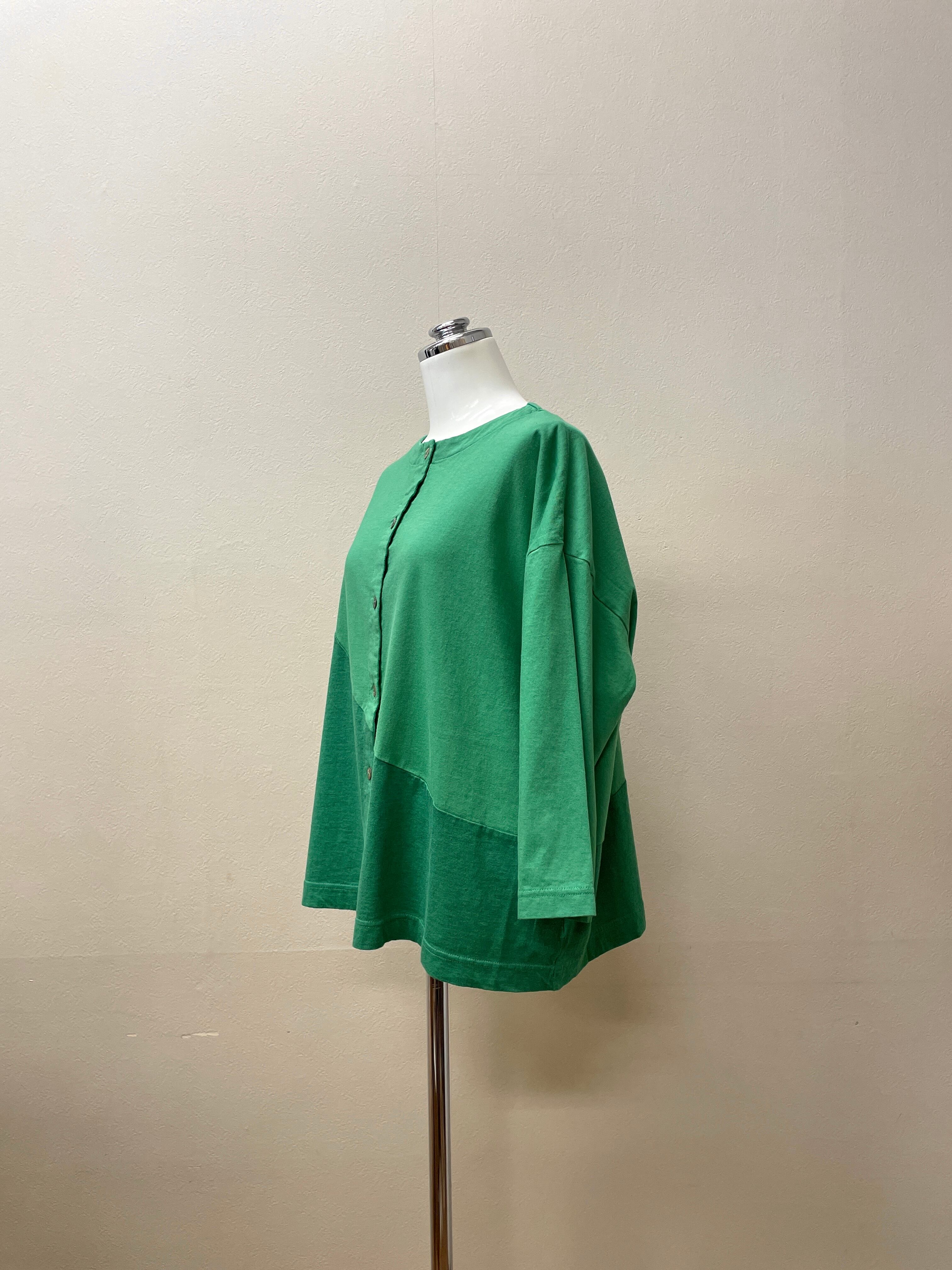 肌触りが心地良く、夏場におすすめの綿天竺カーディガン。天竺と杢グレー天竺で切り替えて製品染めすることで色の濃い部分を作ってます。シンプルでコーディネートしやすいアイテムです。冷房対策にもおすすめ。